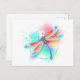 Red, flying, artistically drawn, in bright colours with textured iridescent, blue wings on white background, painted over with splashes of watercolor paint. Bright red dragonfly.