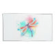 Red, flying, artistically drawn, in bright colours with textured iridescent, blue wings on white background, painted over with splashes of watercolor paint. Bright red dragonfly.