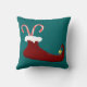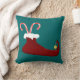 Whimsical Christmas design. A red elf slipper with 2 red candy canes nestled inside. This pointy toed shoe has a bell hanging off the toe and has a white fluffy border around the opening. background is a festive green.