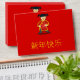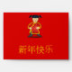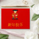 Happy New Year wishes are written in Chinese on a red envelope. There is a young girl who is laughing.