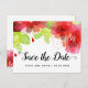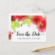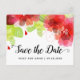 Handwritten script calligraphy and red ethereal flowers floral spring wedding Save the Date postcard. The upper part is covered with pretty red and pink flowers and green leaves.