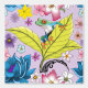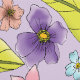 A cute red eyed tree frog upon three leaves against a backdrop of light purple and flowers