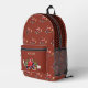 Back to school backpack, in barn red, with farm tractors design. Add the child's name to the front zippered pocket, in tan, printed font, above a single tractor image. The red tractor design includes some fun, farm animals and a dog, and is patterned over the front and sides. Tractor tire marks, in black, go across the zipper section at the top. A cute design for boys or girls.