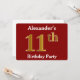 This invitation design features the ordinal number "11th" with a faux gold-like appearance. It also features a custom name, and a red background. The event details on the back can be customised. It could be used to invite people to somebody’s eleventh birthday party. [~Z0000012]