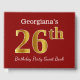 This guest book design features the ordinal number "26th" with a faux/imitation gold-like appearance. It also features a personalised name, and a red coloured background. It could be used at a party for somebody celebrating their twenty sixth birthday. [~Z0000055]