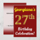 This birthday party invitation design features a message like "Georgiana’s 27th Birthday Celebration!", where the name can be personalised, and where the number "27th" has a faux gold-like appearance. It also features a red coloured background. The event details on the back can be customised. It could be used to invite people to somebody’s twenty seventh birthday celebration or birthday party. [~Z0000120]