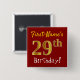 This simple square button design features a message like "First-Name’s 29th Birthday!", with the "29th" having a faux/imitation gold-like colouring look, on a red coloured background. The name can be customised. Buttons like these could perhaps be worn by guests at a birthday party for somebody who is celebrating their twenty ninth birthday, where the party is being held in a large area with lots of other people present (such as a city park or a theme park). [~Z0000163]