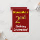 This birthday party invitation design features a message like "Samantha’s 2nd Birthday Celebration!", where the name can be personalised, and where the number "2nd" has a faux gold-like appearance. It also features a red coloured background. The event details on the back can be personalised. It could be used to invite people to somebody’s second birthday celebration or birthday party. [~Z0000120]