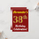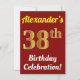 This birthday party invitation design features a message like "Alexander’s 38th Birthday Celebration!", where the name can be personalised, and where the number "38th" has a faux gold-like appearance. It also features a red coloured background. The event details on the back can be personalised. It could be used to invite people to somebody’s thirty eighth birthday celebration or birthday party. [~Z0000120]