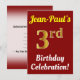 This birthday party invitation design features a message like "Jean-Paul’s 3rd Birthday Celebration!", where the name can be personalised, and where the number "3rd" has a faux gold-like appearance. It also features a red coloured background. The event details on the back can be personalised. It could be used to invite people to somebody’s third birthday celebration or birthday party. [~Z0000120]