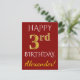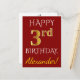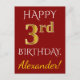 This simple, personalised birthday postcard design features the message "HAPPY 3rd BIRTHDAY", with the "3rd" having a faux gold-like appearance. The front also features a personalised name, and a red background. The back features a customisable birthday greeting message, along with the customisable address of the birthday postcard recipient. It could be sent to somebody who is celebrating their third birthday. [~Z0000071]