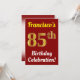 This birthday party invitation design features a message like "Francisco’s 85th Birthday Celebration!", where the name can be personalised, and where the number "85th" has a faux gold-like appearance. It also features a red coloured background. The event details on the back can be customised. It could be used to invite people to somebody’s eighty fifth birthday celebration or birthday party. [~Z0000120]