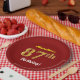 This simple, customisable, birthday-themed paper plate design features a customisable message like "ANameHere’s 87th Birthday!", where the name can be changed, and with the "87th" having a faux/imitation gold-like appearance. It also features a red coloured background. Paper plates like these could perhaps be used at a party being held to celebrate somebody’s eighty seventh birthday. [~Z0000144]