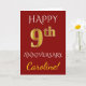 This simple, personalised wedding anniversary greeting card design features the message "HAPPY 9th ANNIVERSARY", with the "9th" having a faux gold-like appearance. The front also features a customised name, and a red coloured background. The inside features a personalised wedding anniversary greeting message. It could be given to a husband or a wife in celebration of the couple’s ninth wedding anniversary. [~Z0000078]