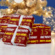 This wrapping paper design features a message like "FIRST-NAME’S 15th BIRTHDAY!", with the "15th" having a faux/imitation gold-like colour appearance, and with the name and "BIRTHDAY" in a fun, bold font. The name can be personalised, and the background is coloured red. Wrapping paper like this could perhaps be used when wrapping birthday gifts being given to somebody in celebration of their fifteenth birthday. [~Z0000204]