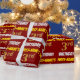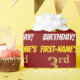 This wrapping paper design features a message like "FIRST-NAME’S 3rd BIRTHDAY!", with the "3rd" having a faux/imitation gold-like colour appearance, and with the name and "BIRTHDAY" in a fun, bold font. The name can be personalised, and the background is coloured red. Wrapping paper like this could perhaps be used when wrapping birthday gifts being given to somebody in celebration of their third birthday. [~Z0000204]