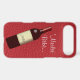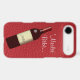 Faux red leather with a textured look. Photo generated close-up of tanned, embossed, and dyed red leather. Wine bottle tilting to the left, with french text, "'Merlot Bèbè" at top.