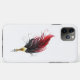 Artistically drawn, antique fountain pen embellished with dark red feather on white background.