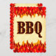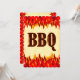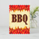 A custom birthday party or BBQ graduation cookout invitation with art of red and orange flames reading BBQ on the front and editable text in western style brown and red letters on the back.