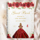 This elegant and glamourous birthday party guest book features a beautiful princess with blonde hair and fair skin in a red ball gown. The text combines handwritten script and modern sans serif fonts for a classy and sophisticated look. The floral arrangements, butterflies and gold confetti create the perfect blend of rustic and chic.
