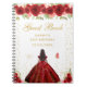 This elegant and glamourous birthday party guest book features a beautiful princess with dark hair and dark skin in a red ball gown. The text combines handwritten script and modern sans serif fonts for a classy and sophisticated look. The floral arrangements, butterflies and gold confetti create the perfect blend of rustic and chic.