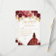 This elegant and glamourous Quinceañera rsvp card features a beautiful princess with dark hair in a tiara and red ball gown. The text combines handwritten script and modern sans serif fonts for a classy and sophisticated look. The floral arrangements and gold confetti create the perfect blend of rustic and chic.