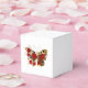 Red peacock eyed flower butterfly with red textured wing, decorated with composition of red, artistically painted roses with golden stems and leaves on white background.