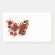 Red peacock eyed flower butterfly with red textured wing, decorated with composition of red, artistically painted roses with golden stems and leaves on white background.
