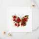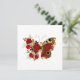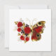 Red peacock eyed flower butterfly with red textured wing, decorated with composition of red, artistically painted roses with golden stems and leaves on white background.