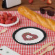 Heart shaped wreath of spring tulips flowers wedding paper plates. Add your own couples monogram initials.Black ink outline with bright red tulip flowers, spring green foliage on crisp white. Other colours and matching wedding items available. Colour requests are also available. © Original ink drawing and design by Sarah Trett for www.mylittleedenweddings.com on Zazzle.
