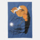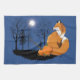 A red fox sits beside pumpkins and autumn leaves. Some Autumn leaves are flying towards the forest in behind the fox
