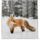 Red fox with bushy tail in cold white snow. Tall green pine tree forest in the background. Beautiful nature.