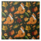 A red fox with pumpkins, acorns and autumn leaves in a backdrop of dark green