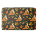 A red fox with pumpkins, acorns and autumn leaves in a backdrop of dark green