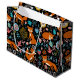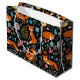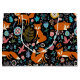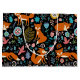 Cute red foxes with flowers and birds in a seamless pattern over black background.