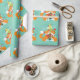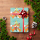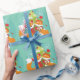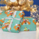 Cute and colourful holiday wrapping paper features two red foxes in earmuffs, winter hats, and striped scarves in front of a decorated Christmas tree with pretty white snowflakes.