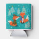 Two Red Foxes wearing warm Winter, hat, sweater and scarf. Christmas background with pine trees and falling snow.