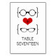 Quirky and chic Geeky Glasses Wedding Table Card featuring a dark red heart flanked by two pairs of geeky eyeglasses, a manly pair and a girly pair representing the groom and bride. This offbeat but sophisticated table number card is perfect for your nerdy wedding! Easy to customise, simply add the appropriate table number(s) in the text fields provided. Click on the "Customise It" button to find additional personalisation options.