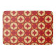 An artistic seamless pattern featuring red, orange, and beige geometric shapes forming interconnected circular and star motifs.