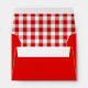 A custom envelope featuring a red background and lined with a red gingham pattern.