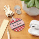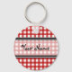 A keychain featuring a background of Red gingham with black trim. Personalise with your name in centre section.