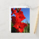 This is a beautiful fully open red gladiolus from my garden. It's in its natural surrounding, so you can see the green leaves and the blue sky in the background. I took this photograph in July 2017.