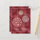 Elegant red glittery faux rhinestone ornaments hanging with a traditional sentiment of Happy Holidays from our home to yours typography. Perfect in a budget elegant holiday postcard.