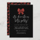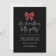 Red Glitter Coquette Bow Lets Party Christmas. Available digitally and printed. Sparkle to invite your festive guests with a faux glitter bow and coordinating pattren on the other side on classic black. A stylish informal set script for Its Christmas Lets Party and the rest of the text you can easily personalise.