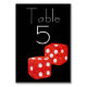 This glamourous custom table number card features a red and black casino design. An image of large, red glitter dice is printed across the centre over a black background. You can personalise the table card to include your own custom name or text.