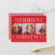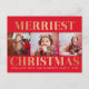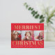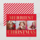 Click customise button to be able to upload 3 of your own images, your images will then appear in the centre of this design between a Christmas holiday greeting saying "Merriest Christmas" in elegant gold foil open-face typography. Under the golden calligraphy you will see a message in clean white type, this you can also personalise with your own short message or family name and year. On the reverse side of this card there are stylish red and white stripes that adds to the festive quality of the design.