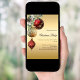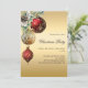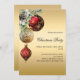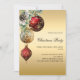 For a Christmas party with family and friends. A faux gold looking background. Decorated with red and gold baubles and some greenery and a pine cone. Personalise and add the details.