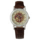 This is a classy wrist watch that works well for any occasion. It features a gold circular border frame with black numbers, and a pretty burgundy red and gold leaf swirl pattern in the inside. Elegant!