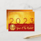 Modern design with golden textured paper (printed image) with large 2023 in red + small round Tiger paper-cut with yellow texts HAPPY NEW YEAR and Year of the Rabbit onto a red background. Design on horizontal holiday postcard with golden background in back. Matching greeting card and square invitation with texts for New year celebration to customise. Perfect for a timeless and modern Chinese New Year of the Rabbit 2023.