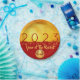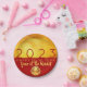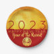Modern design with golden textured paper (printed image) with large 2023 in red + small round Tiger paper-cut with yellow texts HAPPY NEW YEAR and Year of the Rabbit onto a red background. Design on paper plate. Matching square flat invitation card, greeting card, holiday postcard, party supplies and more... Perfect for a timeless and modern Chinese New Year of the Rabbit 2023.